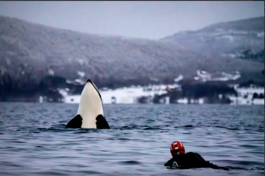 Very near the top of my bucket list is swimming with orcas. It’s the trip I’m most determined to book for 2025.Every year, during the winter months, orcas swim in the fjords of Norway where the herring are plentiful. I’m sure it’s as cold as it looks but you swim with a snorkel in a drysuit at the surface during the few available hours of daylight (if any depending on the time of year.) So far, I haven’t found any reports of snorkelers being eaten by an orca.
